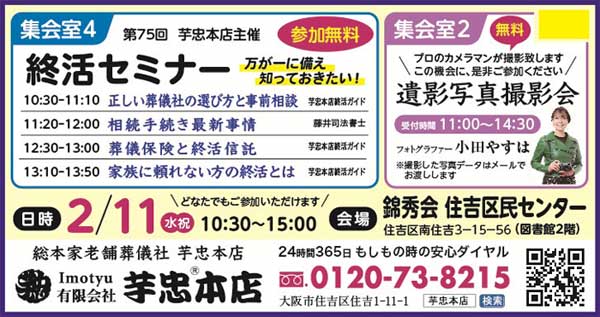 2026年 2月 11日 住吉区民センター集会室にて、第 75回終活セミナーおよび遺影写真撮影会を開催いたしました。 お葬式に関わる話、相続手続きなどの話、終活に関わることを学んでいただきました。 ご来場いただきました皆様、誠にありがとうございました。